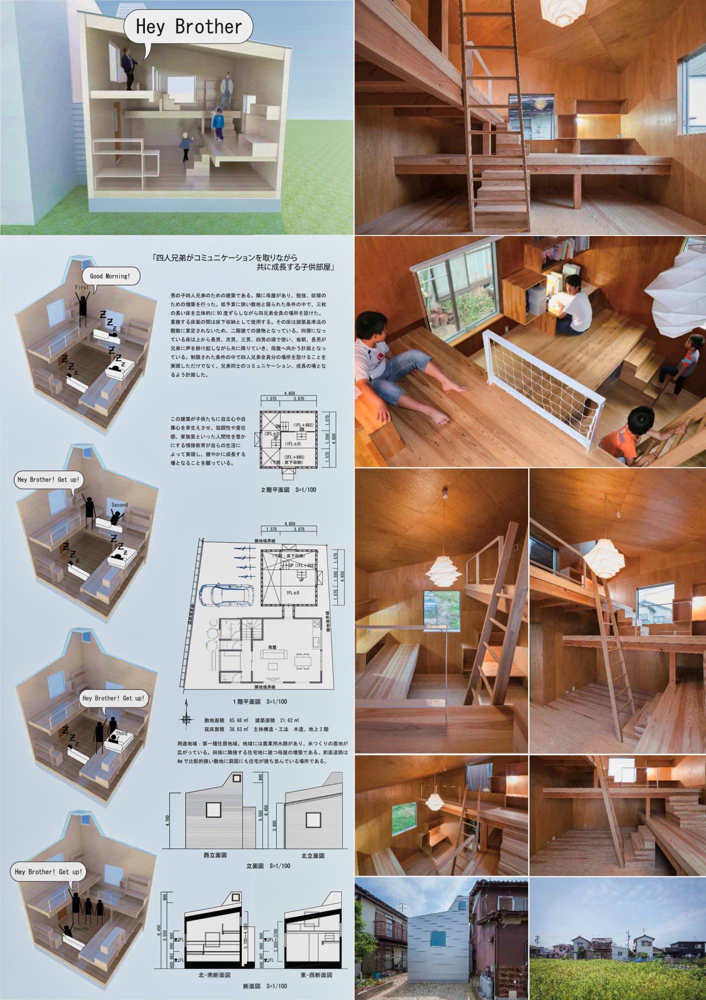 4人兄弟の勉強部屋の増築。たった6.5坪に男4人兄弟の勉強部屋兼寝室。1階から90度ずつ振りながら4層構造で立体的に組み立てた。長男が最上階で、続いて次男、三男、四男と朝起こしながら全員が起きて母屋に向かう。
